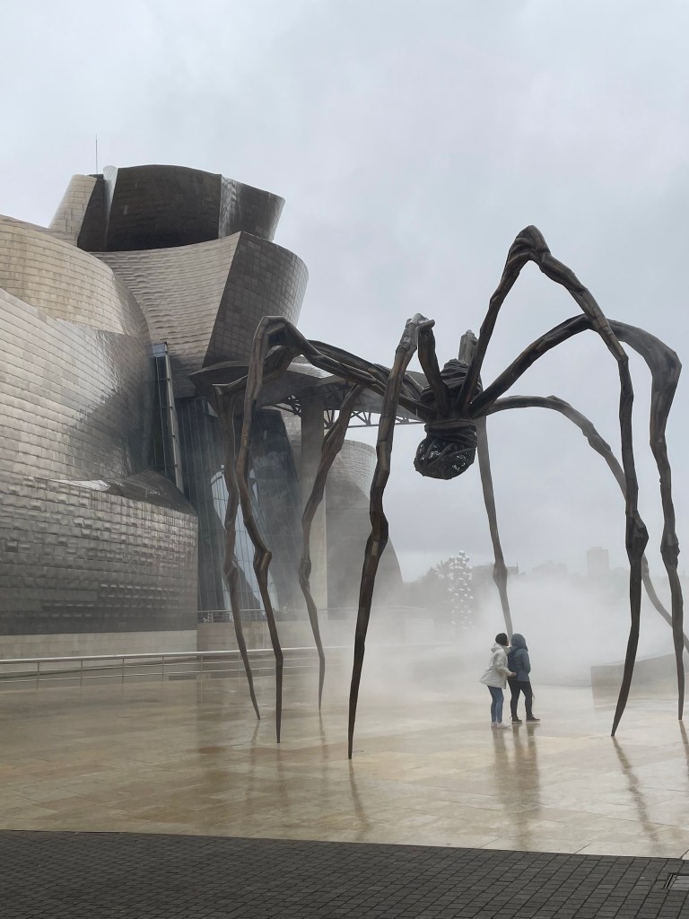 Back to The Guggenheim. Our first afternoon was spent getting our bearings. That and sheltering from hideous rain which came in from nowhere. We had walked down to the museum and as we arrived the heavens opened. Cats and dogs. But not before I got a photo of the outside and of the giant spider first seen in the turbine hall at Tate Modern. I remember it from back then but I think it’s positioning here is more spectacular. And just a little bit creepy. I don’t know if they were blowing dry ice or whether it was mist coming in. But it looked great. Well the couple ( not us) taking a wet selfie were enjoying themselves. Going back two,days later I can confirm it’s dry Ice. Also best to get a picture in the rain. It’s quieter.