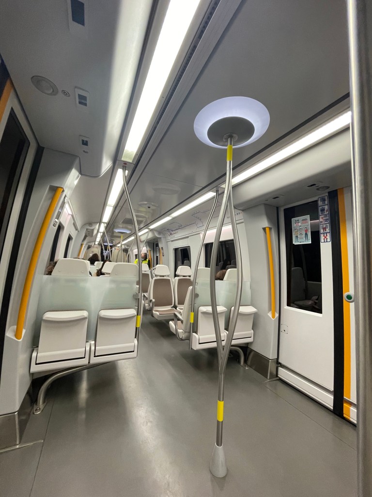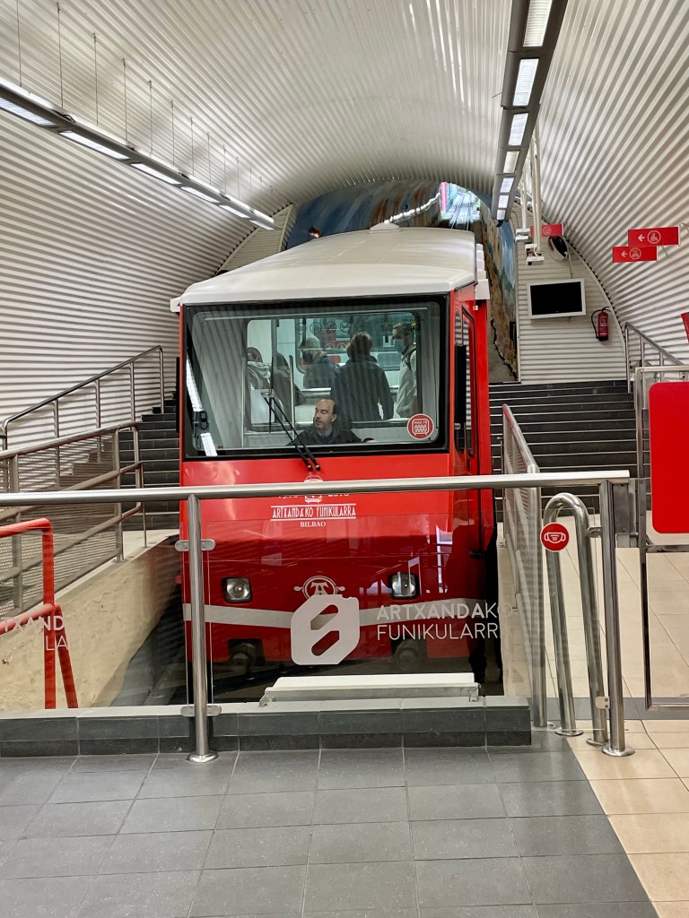 We took the metro to get to the funicular railway and this is the carriage. Modern. Clean. Bright and looking great. This line was quiet Norman Foster was commissioned in 1997 to design stations for a new extension and they are awesome. The entrances ~ glass tunnels take you down to the stations. The curved structures are known locally as Fosteritos. The stations are airy. Light and spacious. They are a joy to,use. And whilst I know many people don’t think wearing a face mask makes the slightest bit of difference, in Spain you are obliged to wear a mask whilst on public transport. And people travelling on public transport here are all compliant. Me. I find it comforting.