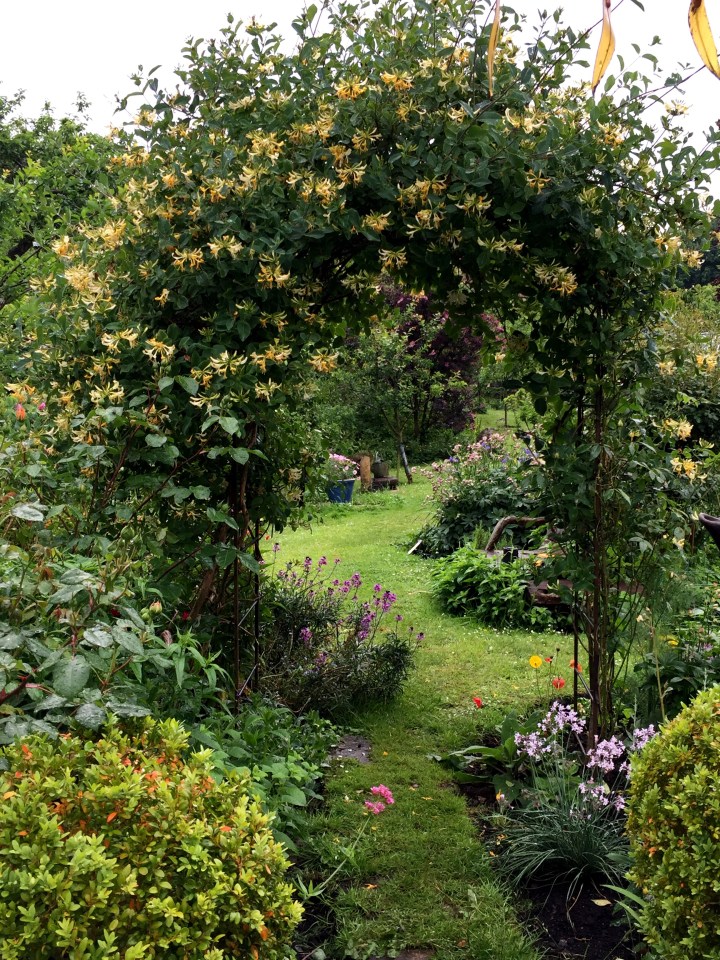 The honeysuckle arch – a Graham Thomas – has had plentiful flowers. But I miss the end of the day scent following the summer heat of the day. It’s been colourful but somehow the scent has been low. I miss the heady smells of the honeysuckle the neighbours Philadelphus Belle Etoule with the lovely dark centre. On my list for the rearranged borders next year. But the roses which have a delicious scent have been fantastic in petal and scent when not ravaged by the rain.