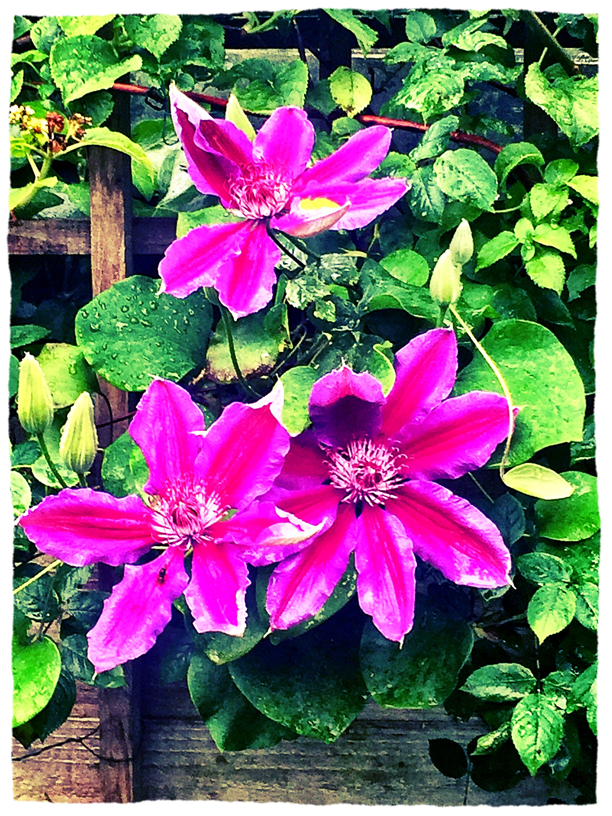 The clematis are patchy.some have flowers like dinner plates. Others like expresso saucers. Tiny. Little  blooms that open and get blown away with the wind.