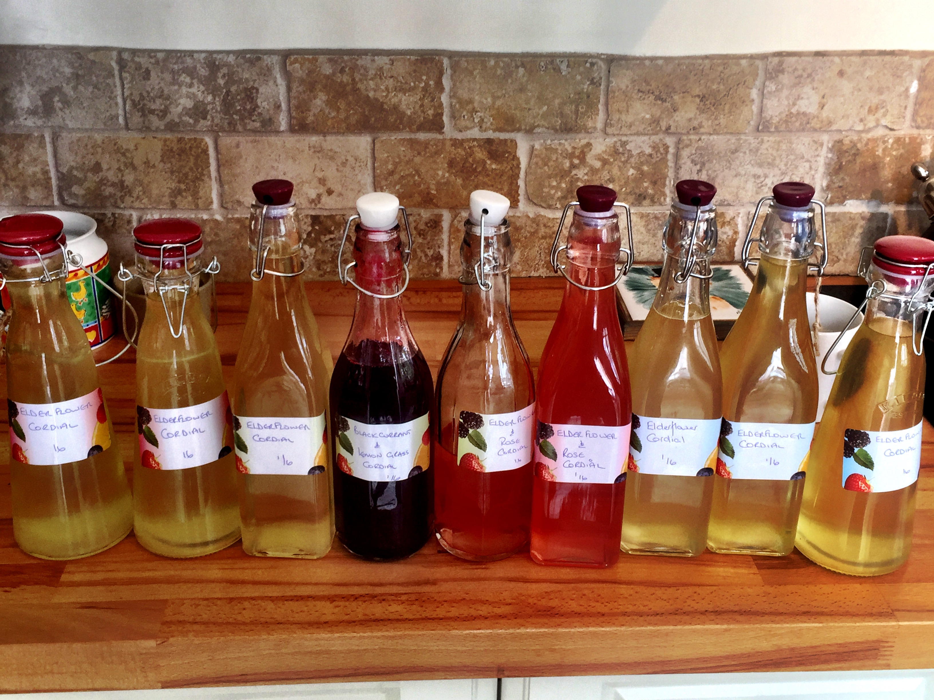 Did I say I’m retired. Well. It also means I have time to use what little produce I have in the garden. Or Produce that gets left on my doorstep. Rhubarb that obviously someone had either been given and didn’t want or they had had enough crumble and tart to last the season. So I’ve been making cordials. Elderflower. Elderflower & rose. Blackcurrant and lemon grass. Rhubarb. I’ve left some strawberry seeping I’m the fridge. Apparently it takes 4 days. So. There will be cordial with water. In prosecco. In gin . There are gooseberries and more black currants to come.  Some black elderflower in the freezer for when I run out.