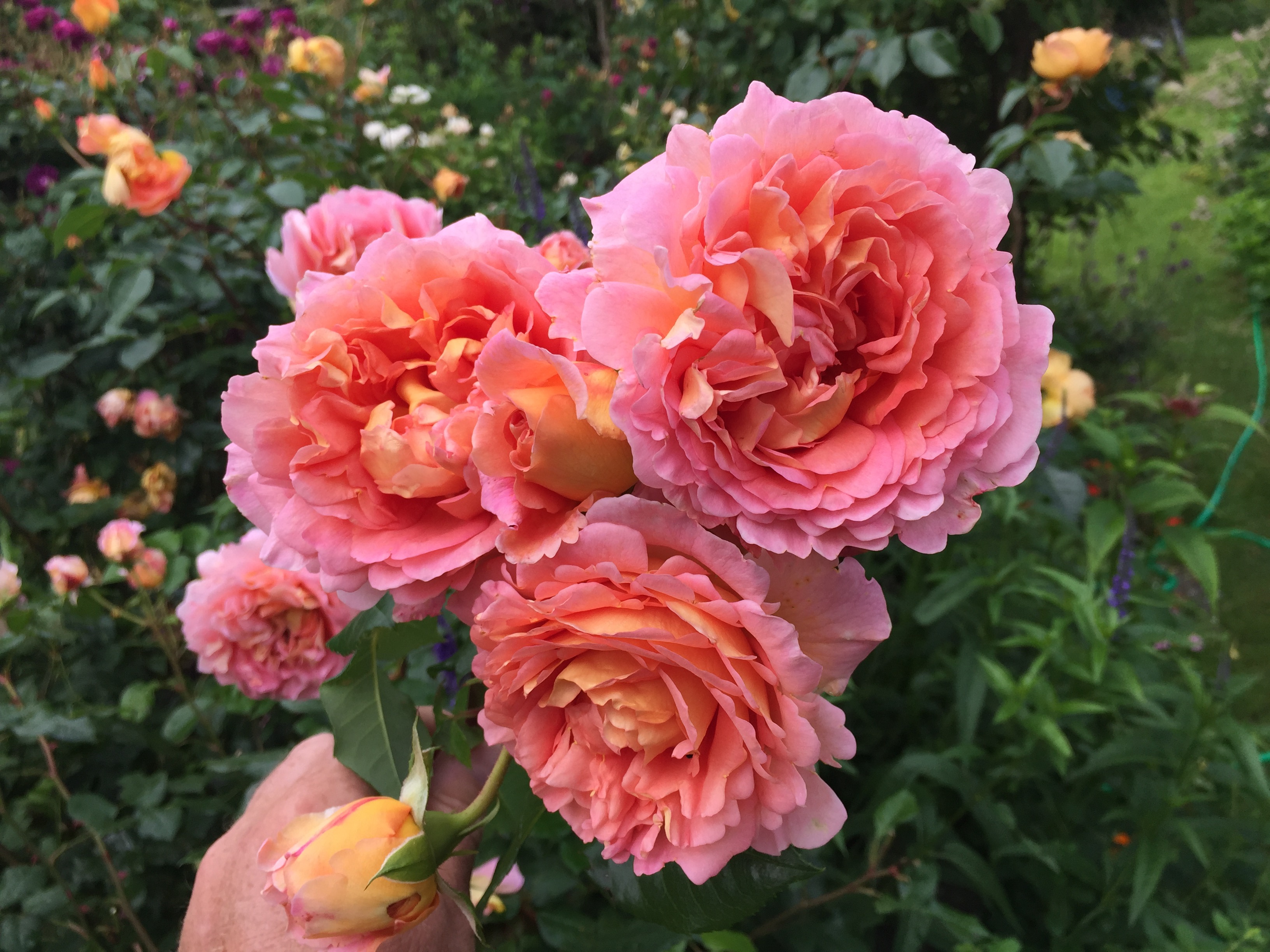 The roses this year are stunning. Those that haven’t gone mildew or rotted on the bush that is. The few days of a little sun this week has meant there have been some great blooms. We were moving a main bed to accommodate a new extension. Which hasn’t happened  so  – I hadn’t pruned them. Too late for the extension. To late to prune. So the branches are long. With stunning  floppy blooms heavy with petals heavy with scent. Sadly black fly is an issue too this year.