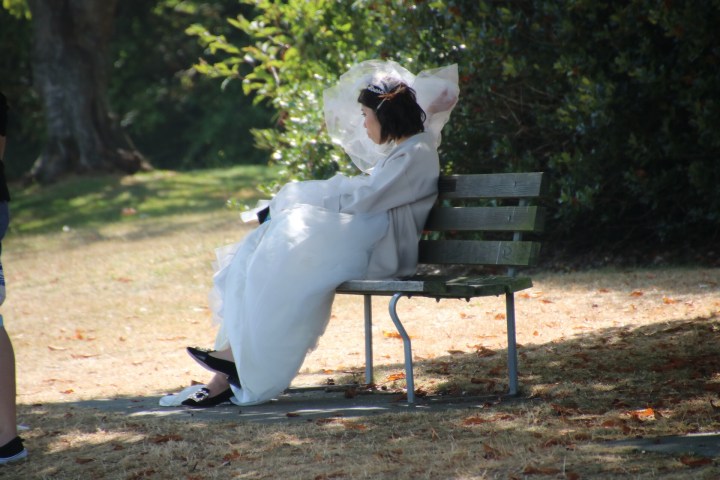 I love people watching – some people call it being nosey. Hands up! Guilty. But look – a bride waiting for a husband. Not it’s not me. Alone on a park bench. A story waiting to be told. She is beautiful
