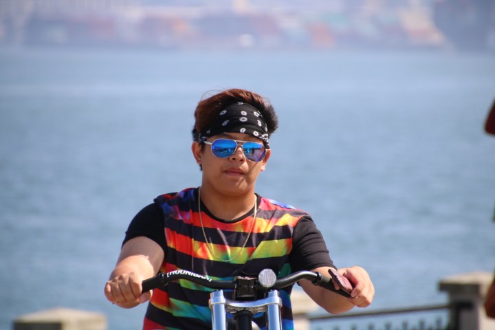 A colourful man on a chopper. Well it looked like a chopper. Hands high. Bottom low. I was in awe of his t shirt. In a larger size obviously. I always wanted a chopper.