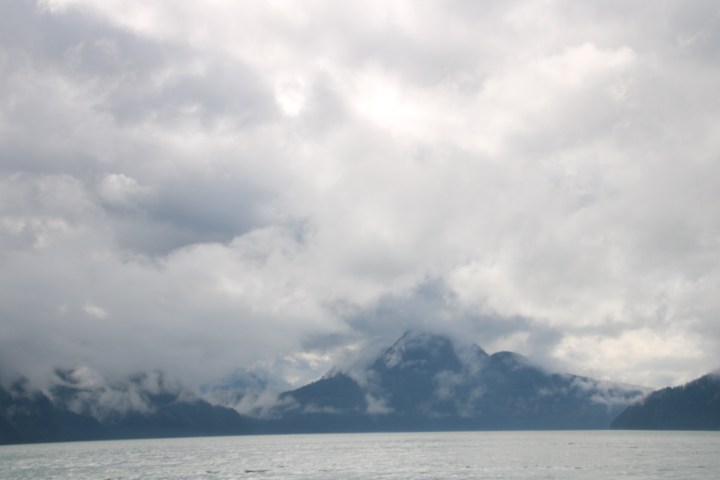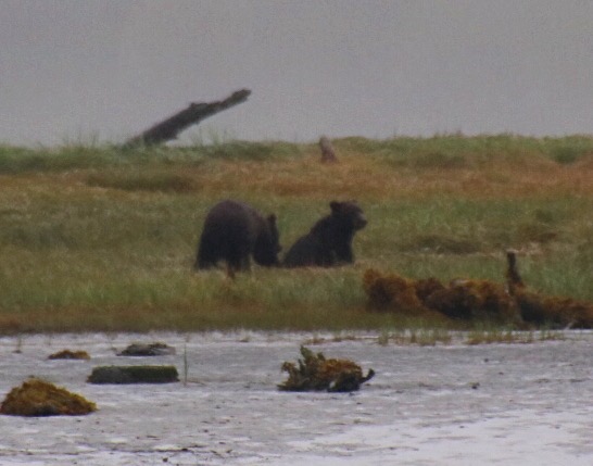 Look over there the guide said. There’s a grizzly bear on the grass. Ian saw it through binoculars. Good buy that. Then there were two. B—/-r this – I whipped the camera out and took some photos. In the rain. Not great as we were a fair way off but cropped and lightened you can see it’s a grizzly. Apparently 3 years old. Ish. I don’t know how he could tell. I suspect he was nether at the birth or is a Godparent.
