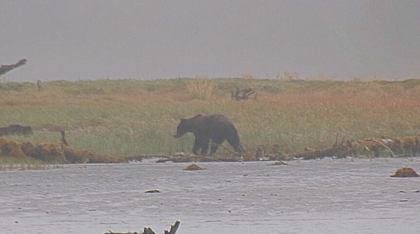 Look over there the guide said. There’s a grizzly bear on the grass. Ian saw it through binoculars. Good buy that. Then there were two. B—/-r this – I whipped the camera out and took some photos. In the rain. Not great as we were a fair way off but cropped and lightened you can see it’s a grizzly. Apparently 3 years old. Ish. I don’t know how he could tell. I suspect he was nether at the birth or is a Godparent.