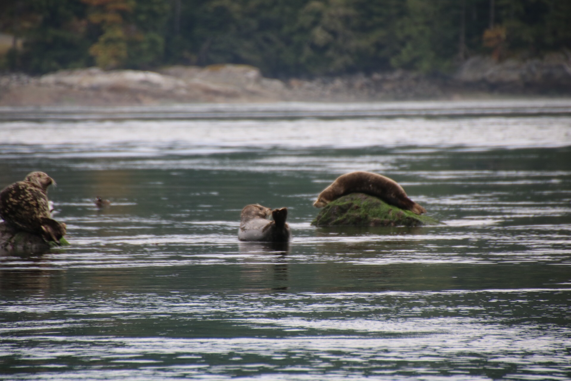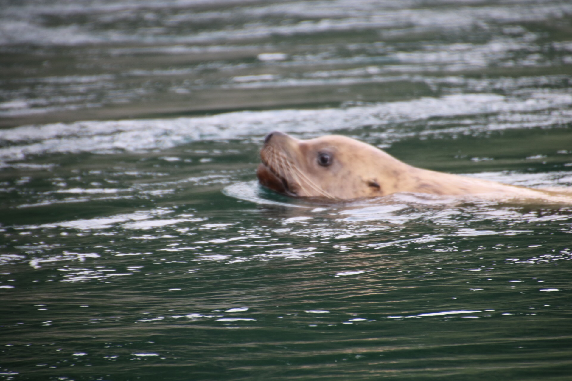 Weather gear hoisted back up. Zipped up. Hats on. Goggles on. We set off again. But it was sunny. Hurrah. But still no whales. We saw sea lions. Big things sea lions. Hunting for salmon. Not the tinned  stuff. Fresh. Plentiful.