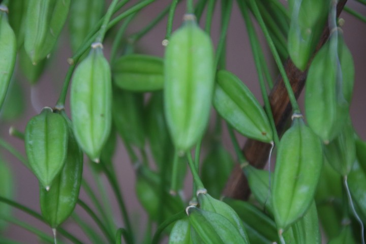 When I left three weeks ago I thought the Stephanotis would flower and be over by the time I got back. Its in a large pot and has struggled a bit but there were still beautiful waxy blooms. As I tidied the plant up I found one single solitary fruit. I never knew that they could fruit – mind you I have only really seen them as pot plants. Indoors. Used in bridal bouquets apparently. Not mine.