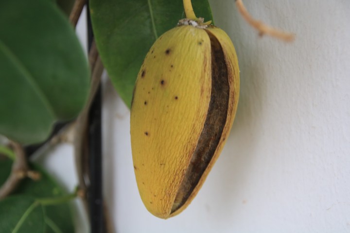 I forgot to take a picture before I left  – the fruit has changed a lot in a week. Apparently the black silky seeds can be easily propagated. Not by me I fear.
