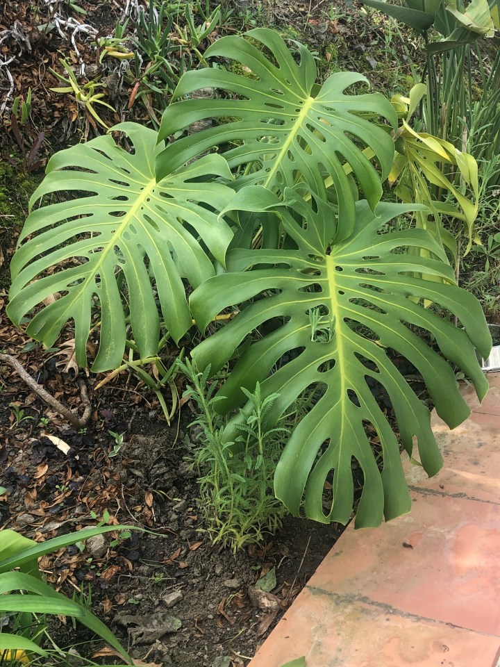 Now I have to admit I’m not a huge lover of the Swiss cheese plant. We always had one of these and a rubber plant as houseplants as we were growing up. But this one is planted in the garden. It’s doing well so it can stay and I’m getting to like it more. There are massive ones in La Conception gardens in Malaga ( Botanical Gardens) which are growing in the shade. I don’t expect this one to get that big.