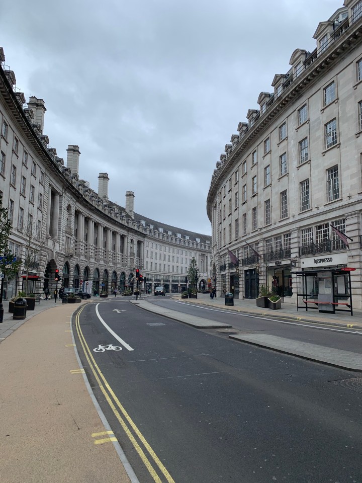 Heading up an empty Regent Street. Usually full of tourists. Of people shopping in the fashion stores. Window shopping. Me dodging the people who head straight at you like you are the pins on a bowling alley and they are the bowls. Me invisible to their elbows or umbrella. Not today. The only thing I’m dodging is the rain.