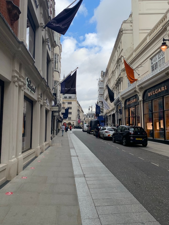 Along Oxford street and down Bond Street or bling street as I used to call it. Full of fashion shops. Chanel. Gucci. Dolce and Gabbana. Hermes. Ralph. Bling jewellery. Tiffany. Cartier. An Auction house. But like everywhere else closed. Some forever. A lone girl skateboarding easily along the street not having to dodge pedestrians or large parked SUV’s.