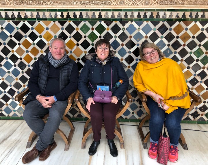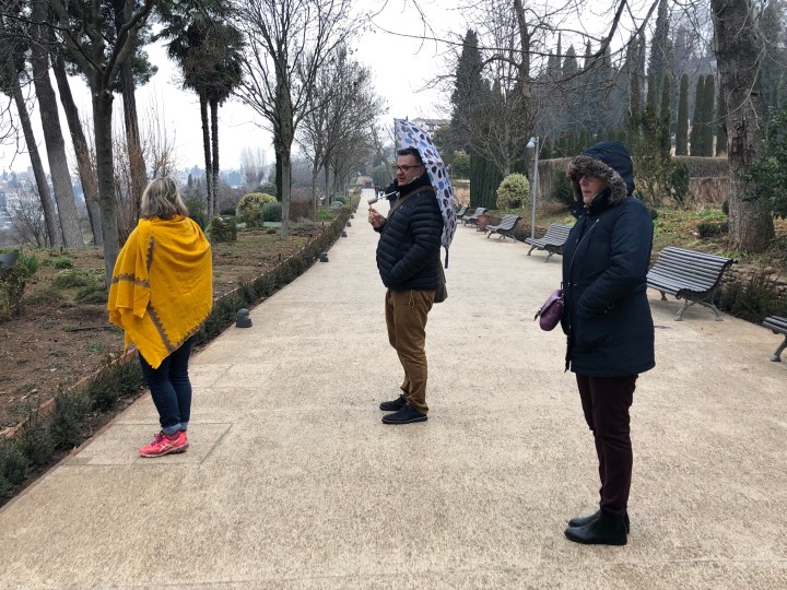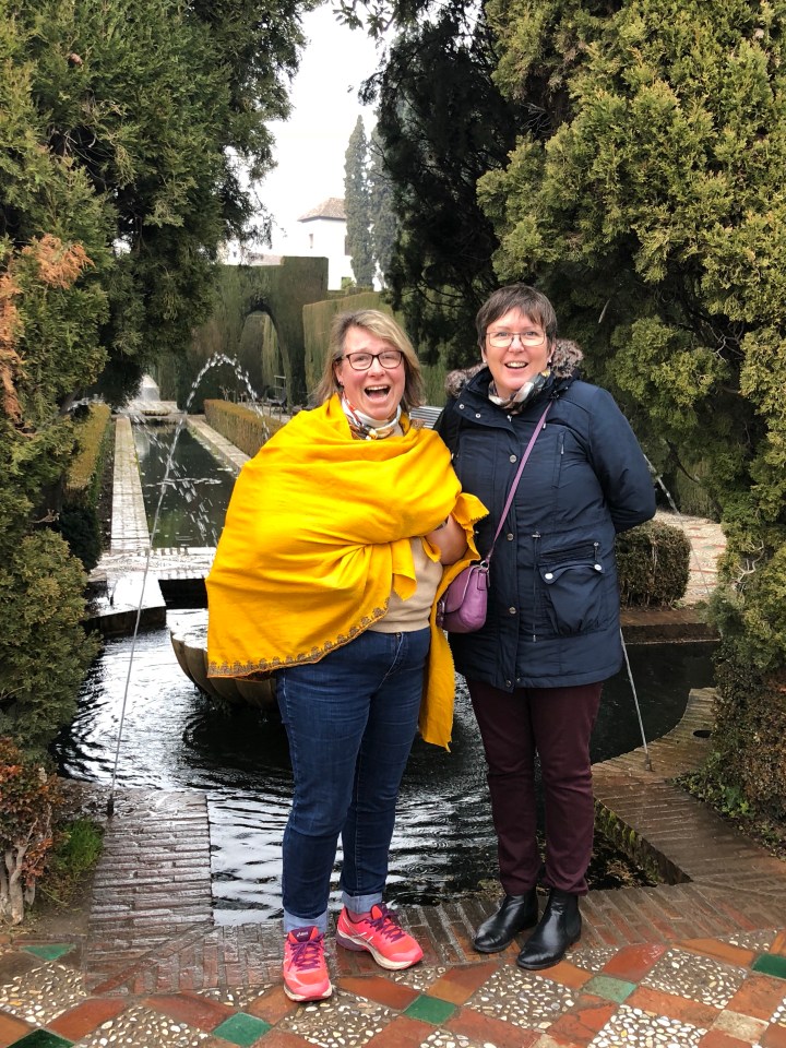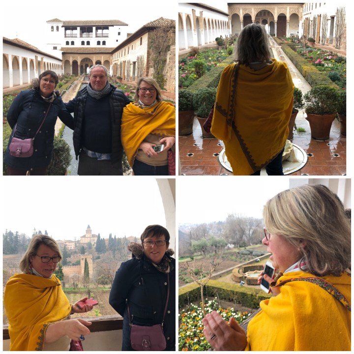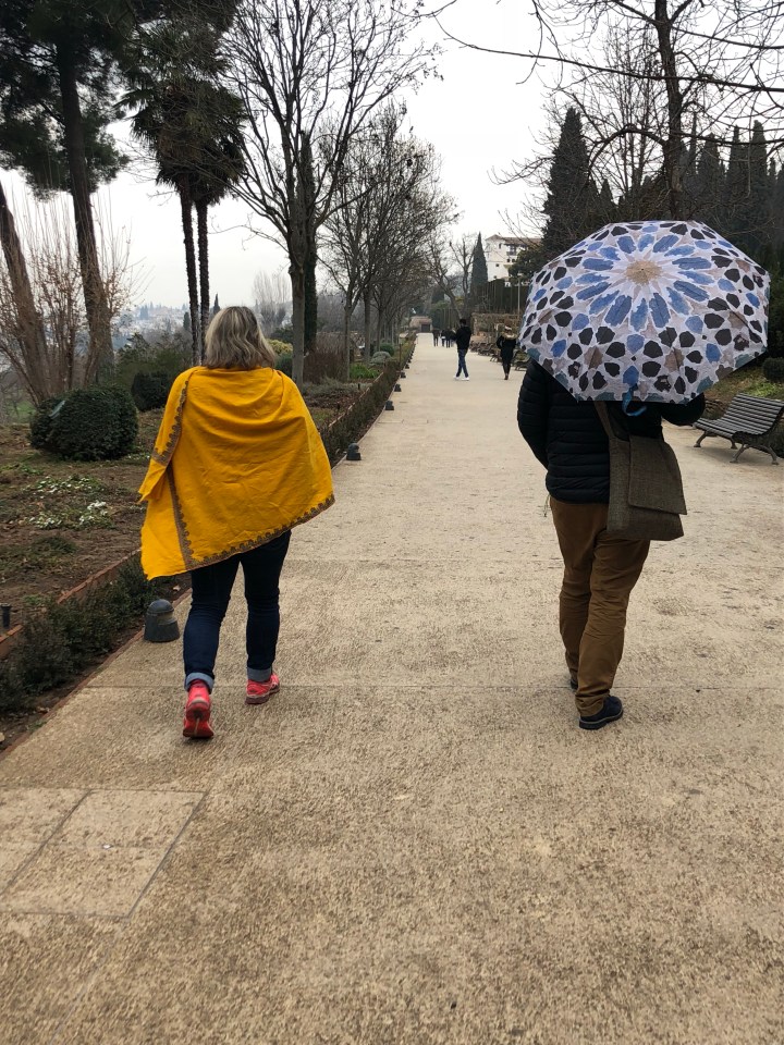 A fashionable arrival. A pashmina that would mean Georgie wouldn’t get lost. Lorraine hidden under a parka. Umbrellas supplied by Ian. Yes. It was drizzly and cold. I keep forgetting how different the temperatures can be. But the Alhambra is high up in the Sierra Nevada. There’s skiing and snowboarding close by. Not me of course. Imagine. Me. Snowboard. Never. It would need stabilisers. But it was cold. Bloody cold.