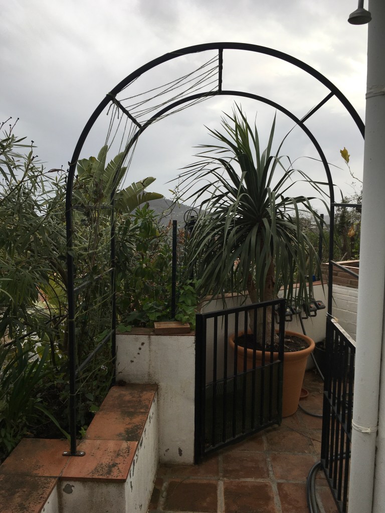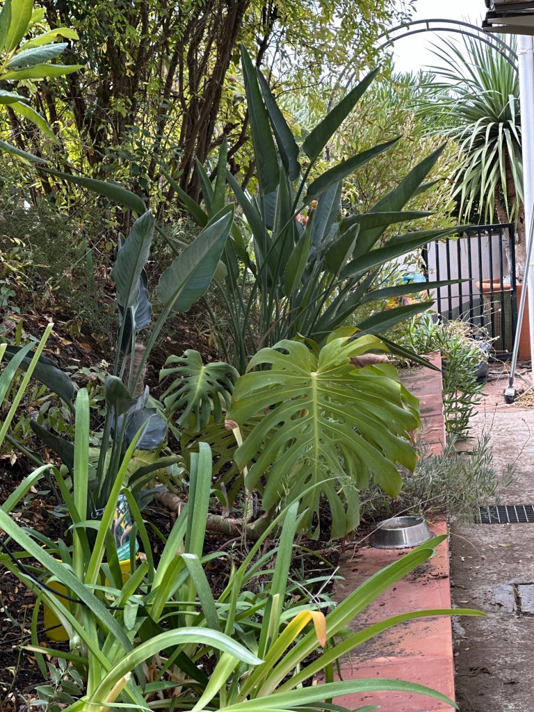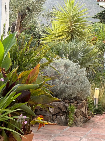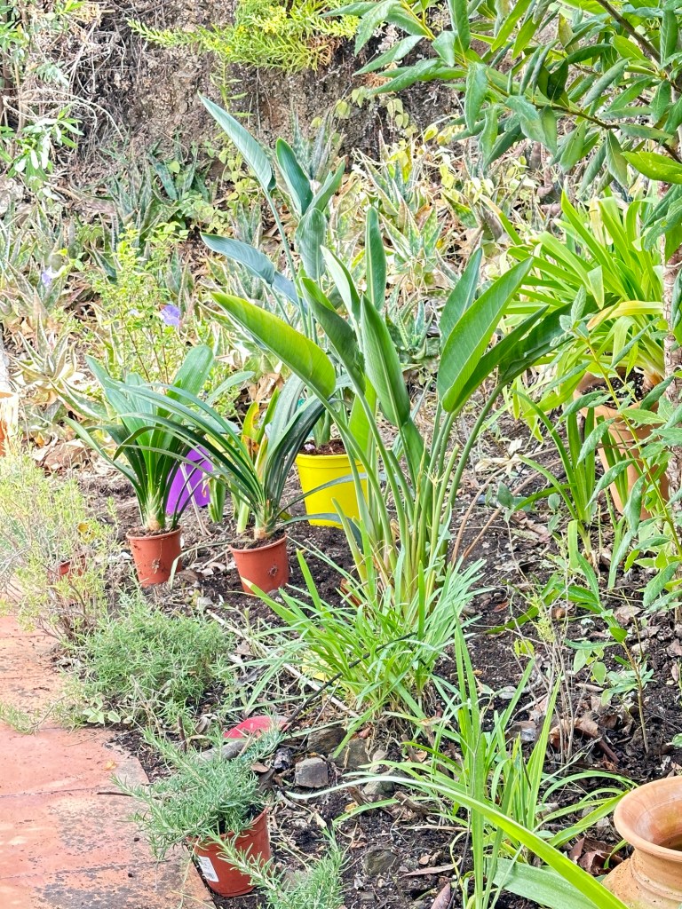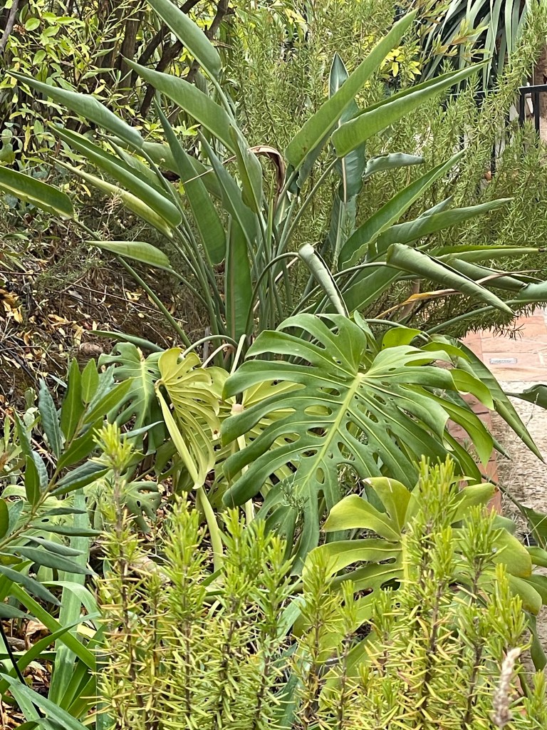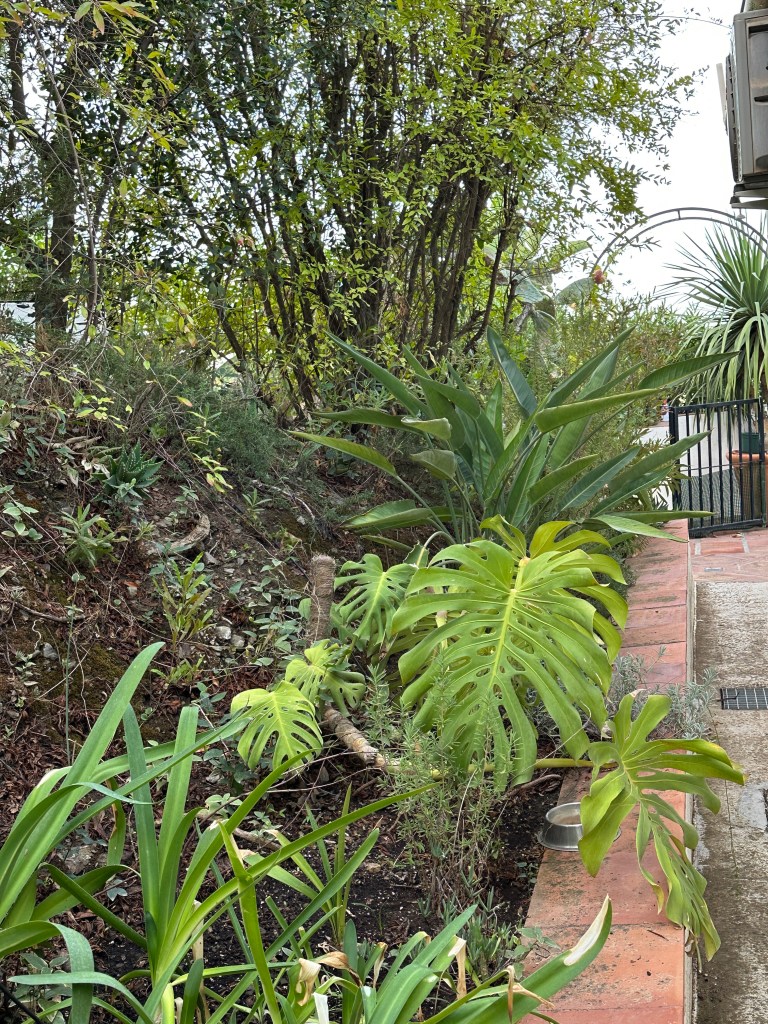 Another plant growing outside is a Swiss cheese plant. In Olden days – my childhood – popular indoor plants included the rubber plant , the Swiss cheese plant and a purple tradescantia. We have the latter two growing in the Mediterranean garden in Cómpeta. I never liked them indoors but they are tolerated in the garden. Unlike the clivia which was an indoor plant in my office which I loved in a pot so I and am happy to have a dozen in the gate bed.