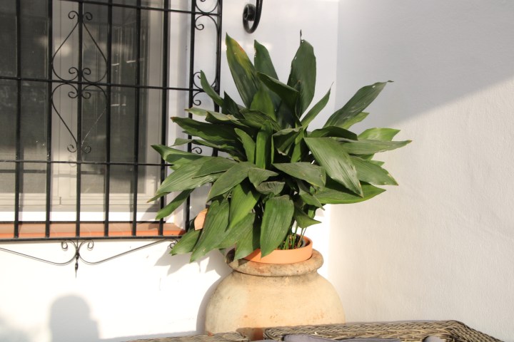 I found a large aspidistra down on the coast. Not literally but at the garden centre. They use these a lot in the inner courtyards so I thought I have a bit of a shady spot on the terrace. So I did. We stayed in a lovely hotel in Seville and they had them in their open area in the centre of the building. That got me hooked. I need to sort the pot.