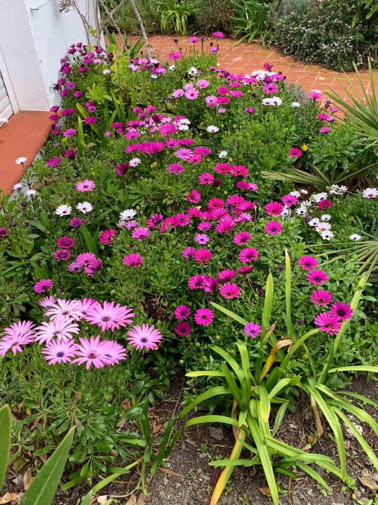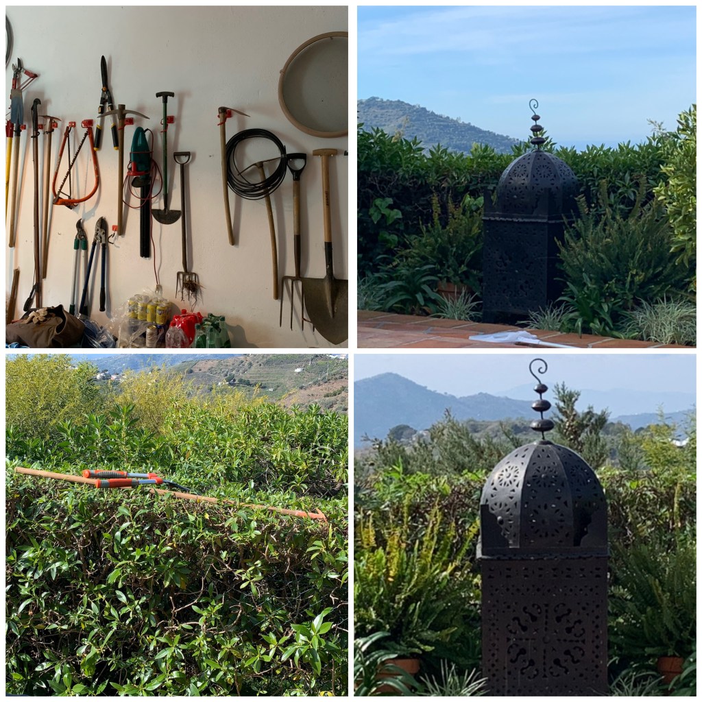 The gardener knew we were arriving and had been in and had cut the hedge. Had shaped the olive tree and had cut the roundabout that’s not a roundabout as well as the rear banks. None of which I am safe to do these days. I’d end up rolling down the hill to the main road and beyond. Not a pretty sight. Me. Not the banks as they look great.
