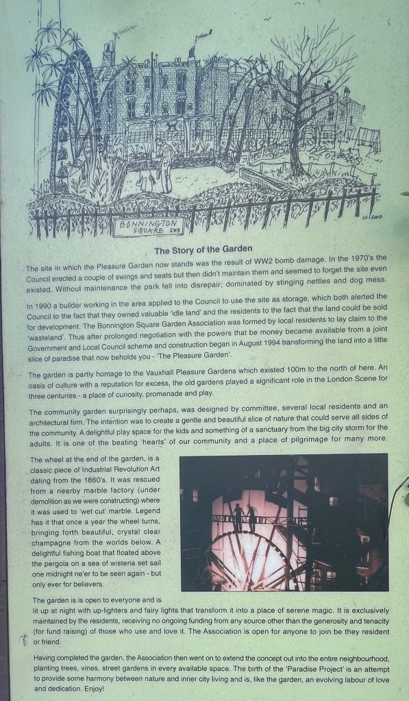It has an interesting history with many of the barges having gardens which open for the National Garden Scheme. The gardens are now as Garden Barge Square .