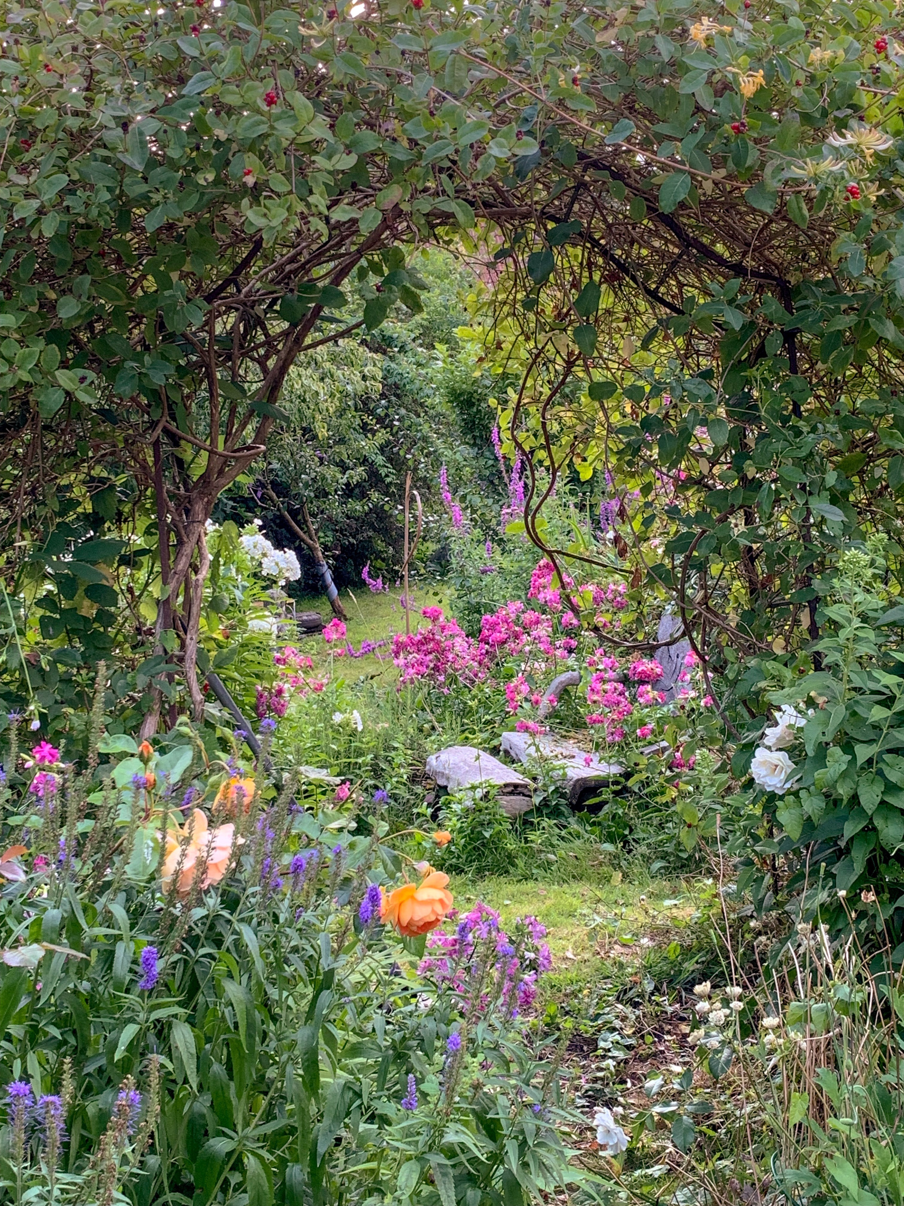 There’s still a lot to do. We put in this inexpensive arch decades ago and it’s now smothered with the scent of honeysuckle. Not now obviously. But at the height of summer it’s glorious. But it needs a bit of a haircut ~ like me. It’s in front of the pergola which was put up two decades ago when we bought no 4 to make the two terraces flow. My big mistake then was bad planning for growing over it. but I have a plan. There’s a theme in this blog. Plans. Garden. House. Cottage. Oh another arch is planned toward the bottom of the garden.