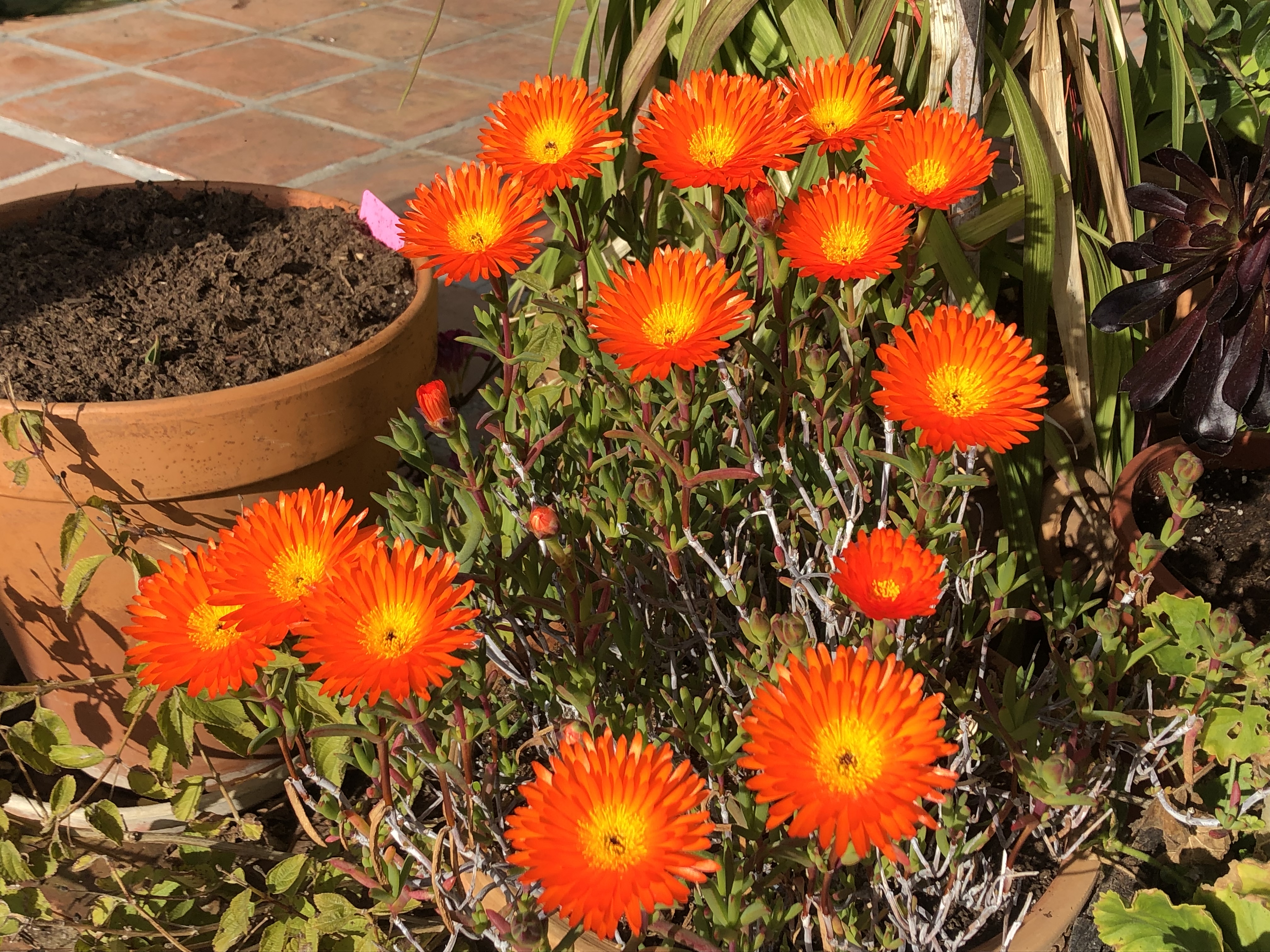 In a pot on the terrace this is finally in flower. Opening with the sun it’s a lovely shade of orange. Would go well with this years Pitcombe tulips which has a bit of an orange theme. Well I think it does. A great succulent which I may be Malephora or maybe Lampranthus. Either way it’s flowering!