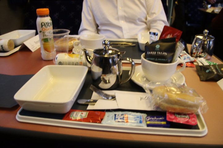 So we managed the Scottish breakfast. Not a cordon bleu delight. – more cordon bleughhhhhh. But hot edible and a hot cuppa tea to go with it. And we had to talk to each other. Sort of.