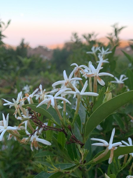 One that’s in so many gardens here and in the uk ~ the star jasmine the one I can’t spell without copying it. Trachelospermum jasminoides which is ok in this garden but not a mad grower.